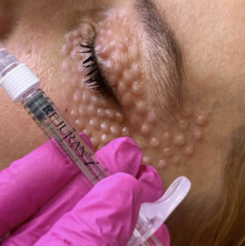 Rejuran is injected as multiple tiny dots just under the surface of the skin known as the ‘dermis’. So immediately after a treatment you will see multiple raised dots all over the skin. This ‘bumpy’ look to the skin lasts for approximately 48 hours – click here to see what Dr Jake’s patient looked like immediately after a forehead and eye treatment.